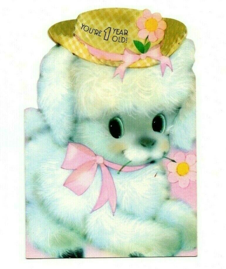 1st Happy Birthday VTG Girls Boys Greeting Card Sweet Dog W/A Flower Unused Ambassador