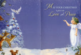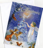 "Christmas Blessings" Golden Angel Girl With Animals Snowing Christmas Tree Sparkling Christmas Greeting Card