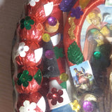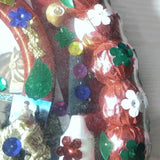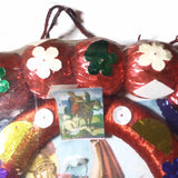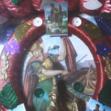 "El Secreto de la Virtuosa Herradura" , 'The Secret of the Virtuous Horseshoe" A large Mexican package amulet made from a used horseshoe wrapped with colorful rayon thread and decorated with sequins and prints of San Martin Caballero. The horseshoe always faces downward.