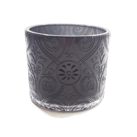Candle Glass Holder Round Translucent Etched Floral Pattern Tumbler Black Gift