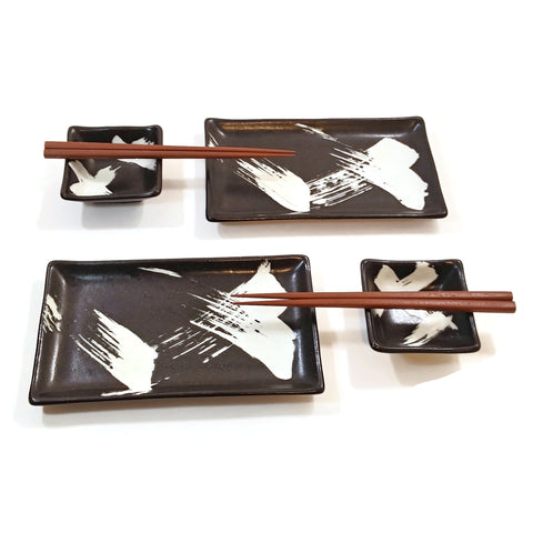 HandCrafted Japanese Zen Design Sushi For 2 Set Black/White Dinnerware Vintage