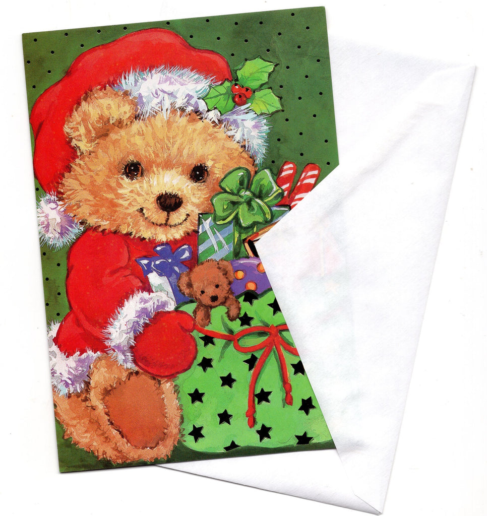 Teddy Bear Santa Claus W/Gifts Christmas Greeting Card Marry Christmas Vintage